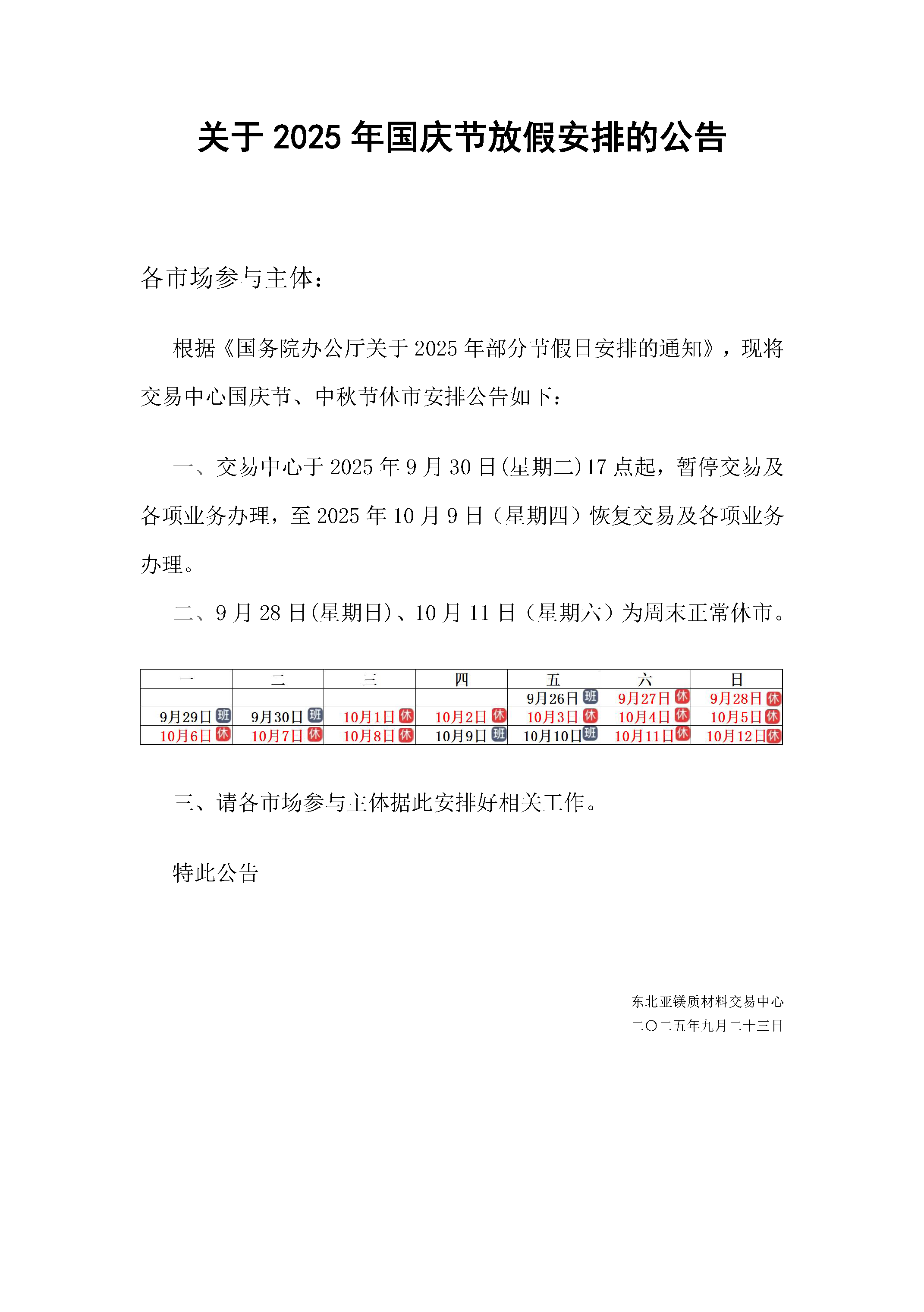 關(guān)于國慶節(jié)放假安排的通知