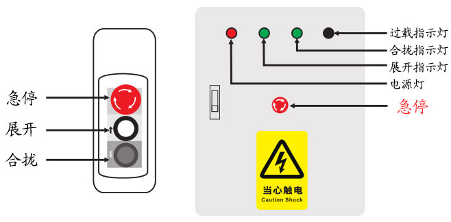 注:手柄開關(guān)使用方法為點(diǎn)動。長按合攏按鈕即可合攏,當(dāng)看臺徹底合攏時,觸碰到限位開關(guān)會自動停止。